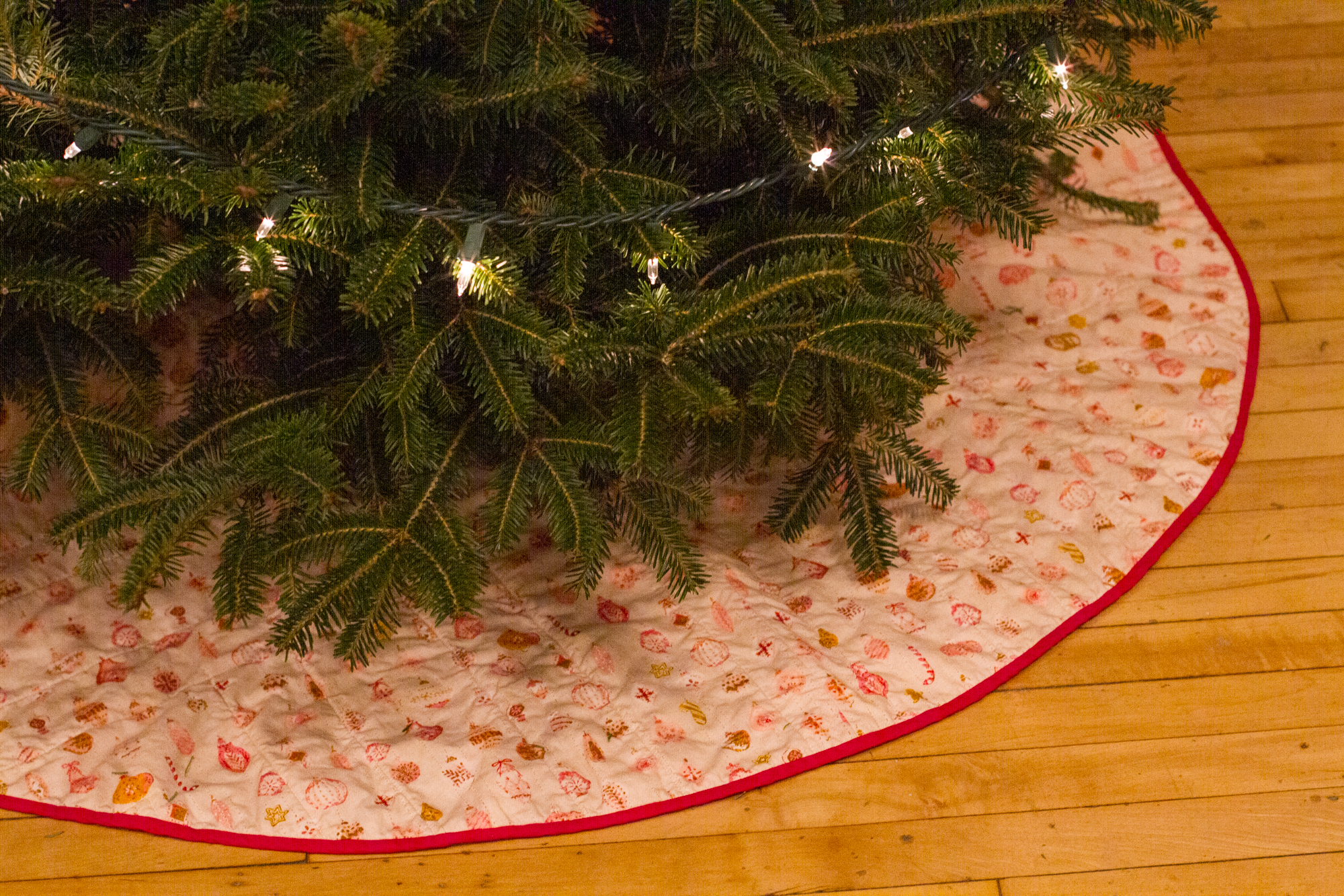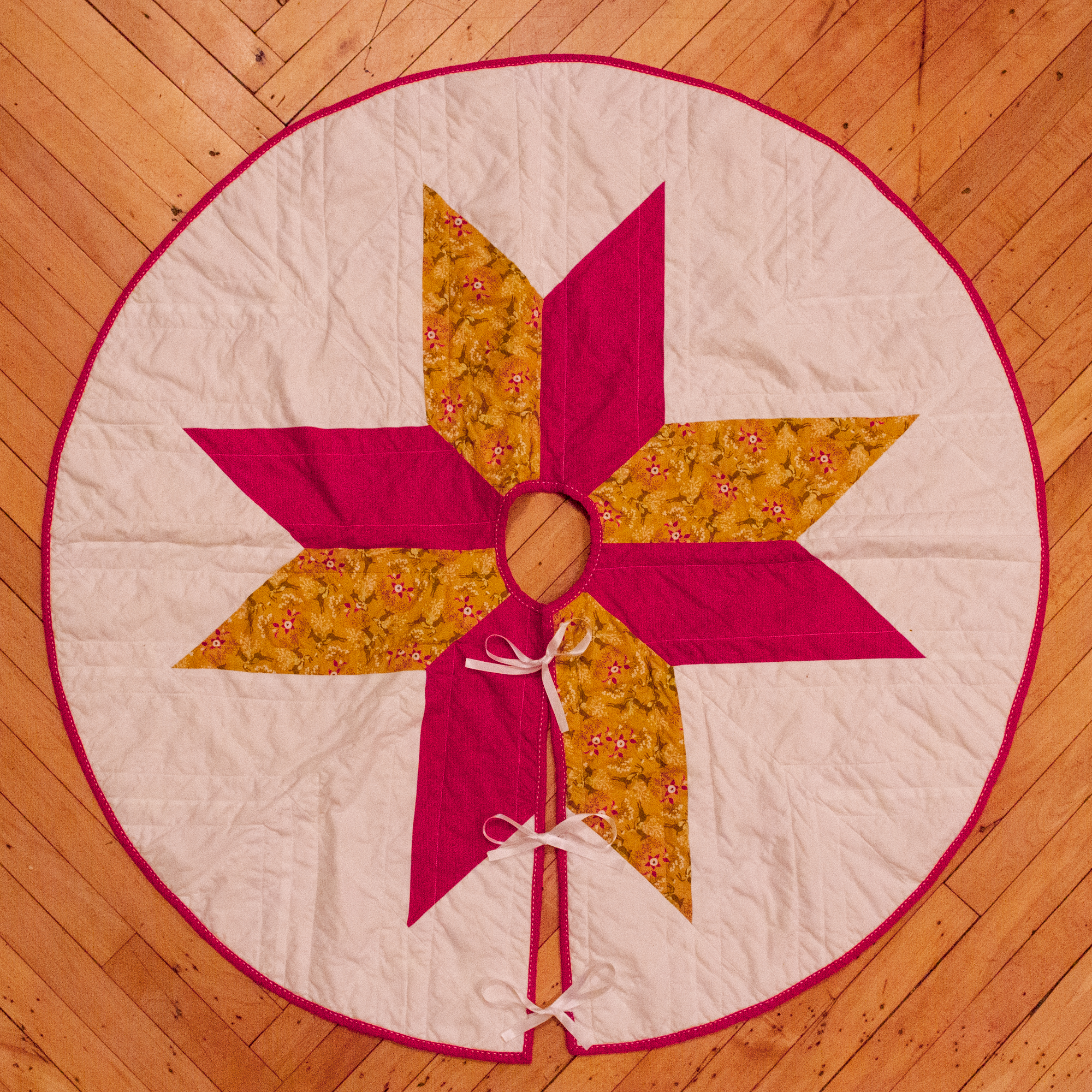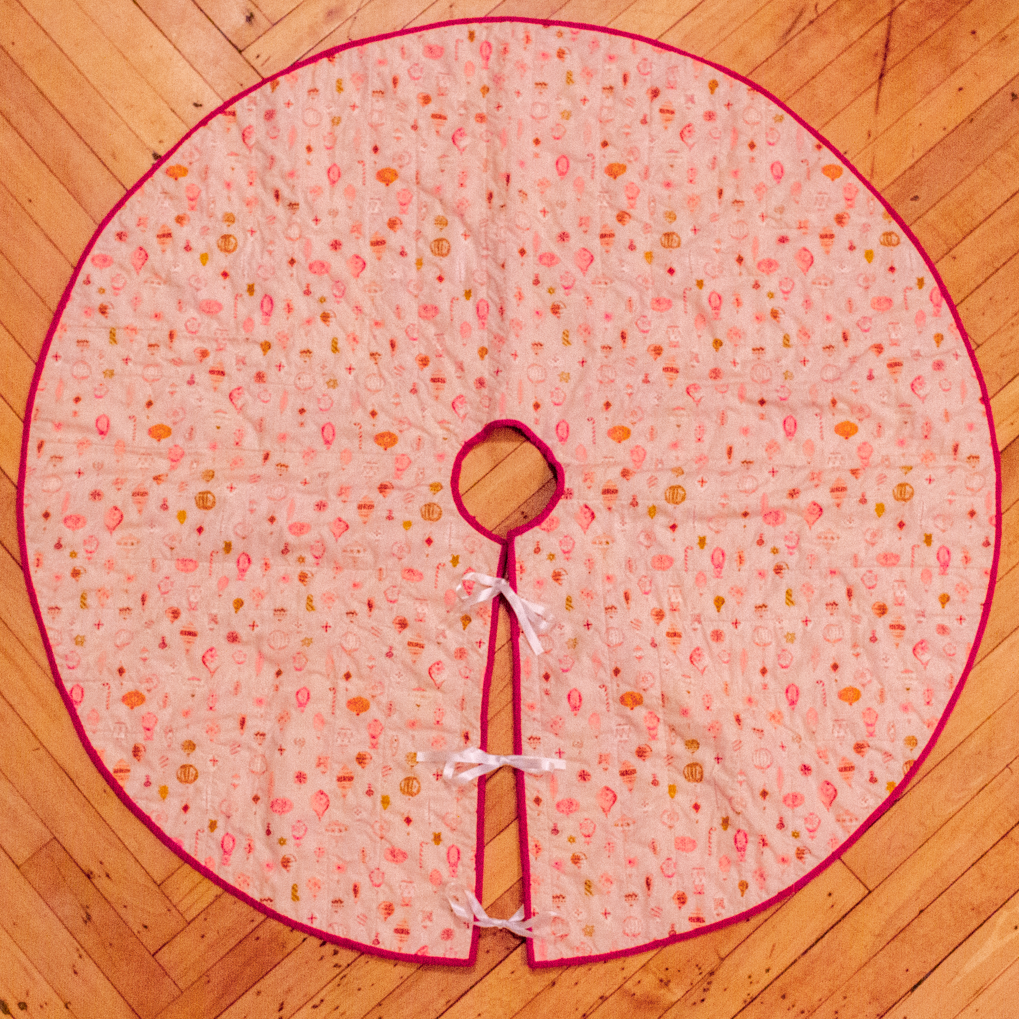 Do you love holiday decorating, but you’re over the classic color scheme? The prints from Art Gallery Fabrics are a delightful twist on the traditional Christmas look. The metallic gold accents on the deer print and the bright color palette are so fun and funky. The reversible side is a delightful AGF ornament print in golds and pinks. The bright pink binding is hand stitched.